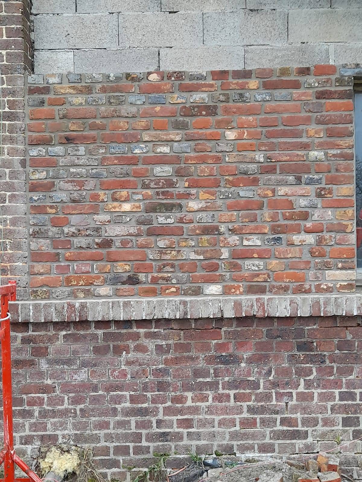 Pour cette rénovation, la pose de brique ancienne est réalisée après un nettoyage approfondi des éléments existants. Ce nettoyage permet de récupérer les briques d'origine dans leur état le plus proche de leur conception initiale, assurant une parfaite intégration dans le projet de restauration. Chaque brique est ensuite posée sur un lit de mortier chaux/ciment, qui offre à la fois la flexibilité nécessaire et la solidité requise pour une durabilité accrue.