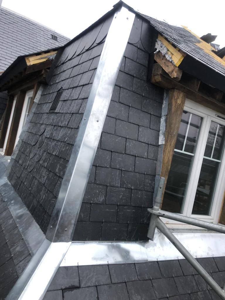 Sur ces photos nous vous présentons la remise à neuf d'une couverture en ardoise naturelle d'Espagne 22x32 . Finition des raccords, bavettes arêtiers et noues identique à l'ancienne en zinc naturel le tout avec une isolation sur rampant de marque Actis