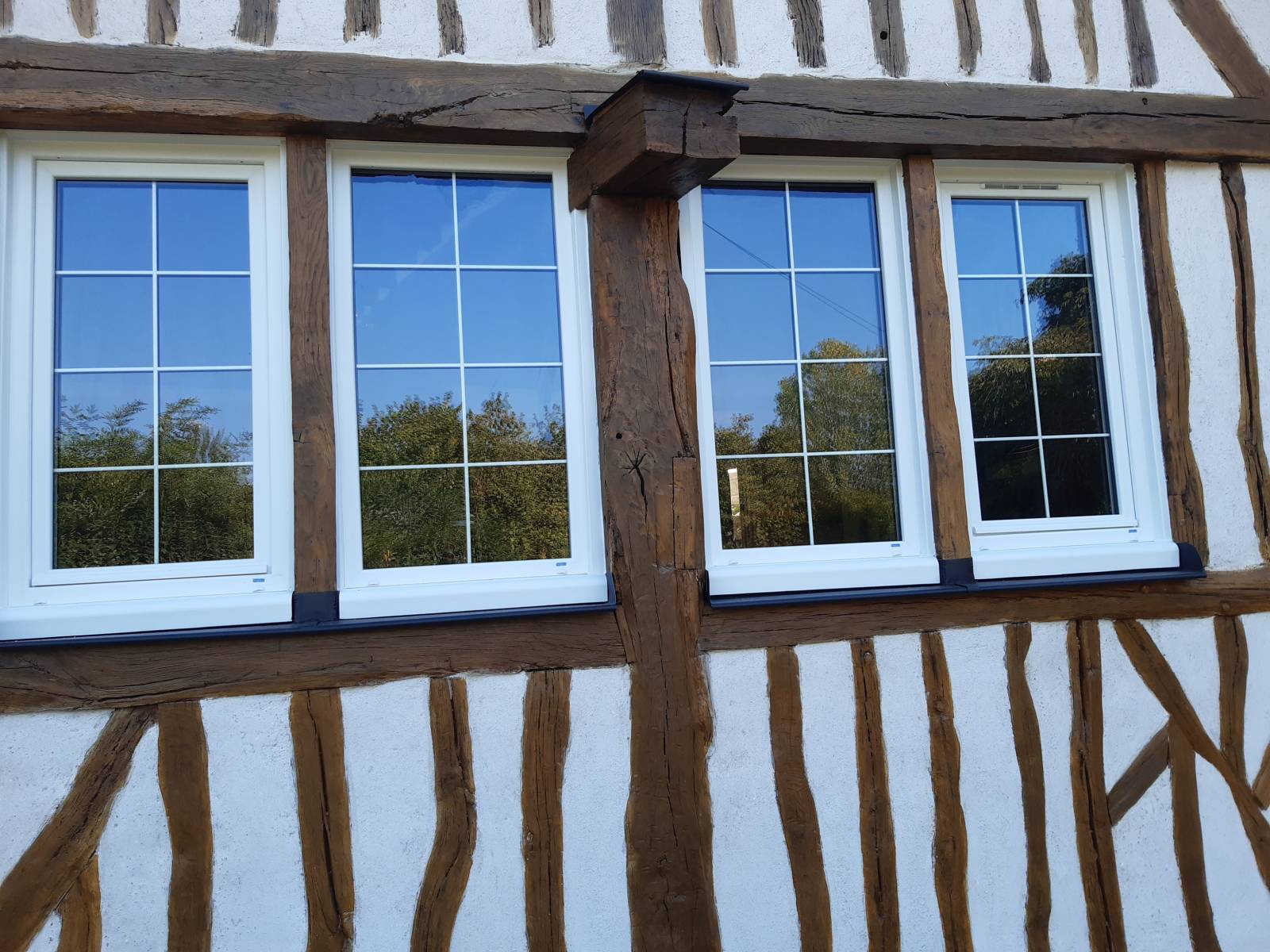 A bientôt pour la remise en état de votre façade, dépose des anciens enduits entre colombage, ponçage, réparation des bois endommagés, traitement lasure des bois, enduit à l'ancienne en chaux/ciment et pose de menuiserie en PVC Blanc et la pose de menuiseries à Andé 27